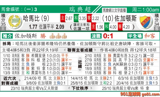 01:00 瑞超 哈馬比:佐加頓斯