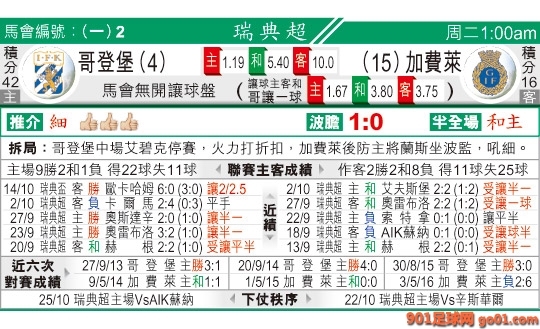 > 01:00 瑞超 哥登堡:加費萊