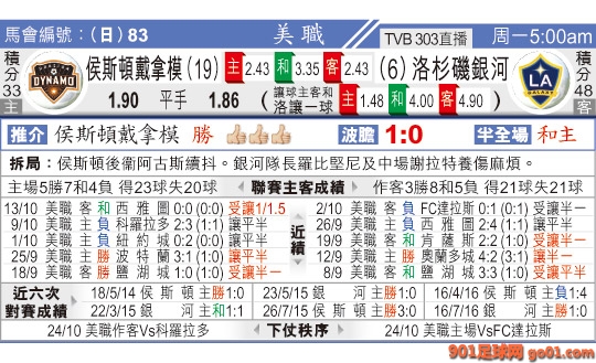 > 05:00 美職聯 侯斯頓戴拿模:洛杉磯銀河