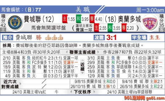 > 03:00 美職聯 費城聯:奧蘭多城