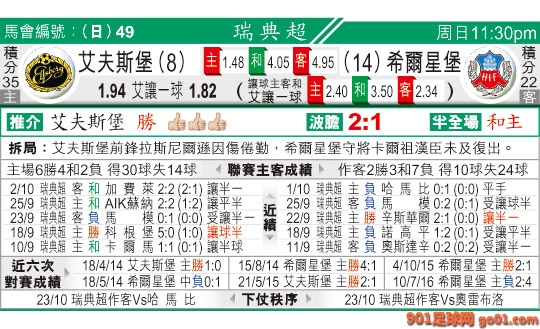 > 23:30 瑞超 艾夫斯堡:希爾星堡